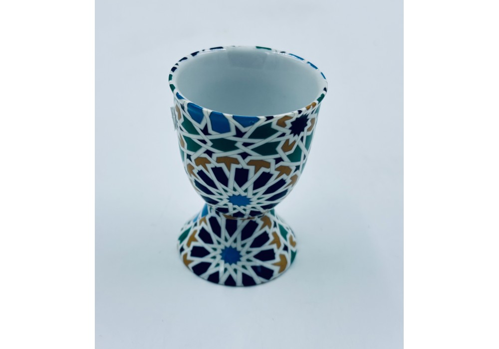 coquetier sur pied en porcelaine décoré au chromo décor Alhambra convient aussi pour les gros oeufs