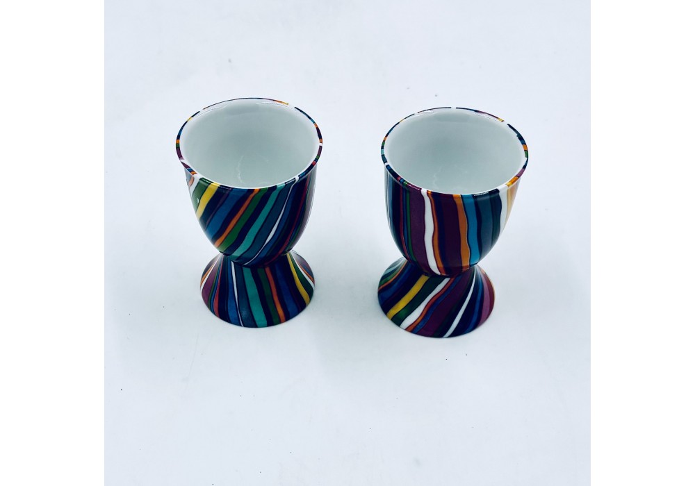 coquetier sur pied décor de rayures colorées . Convient pour des oeufs de gros calibres.