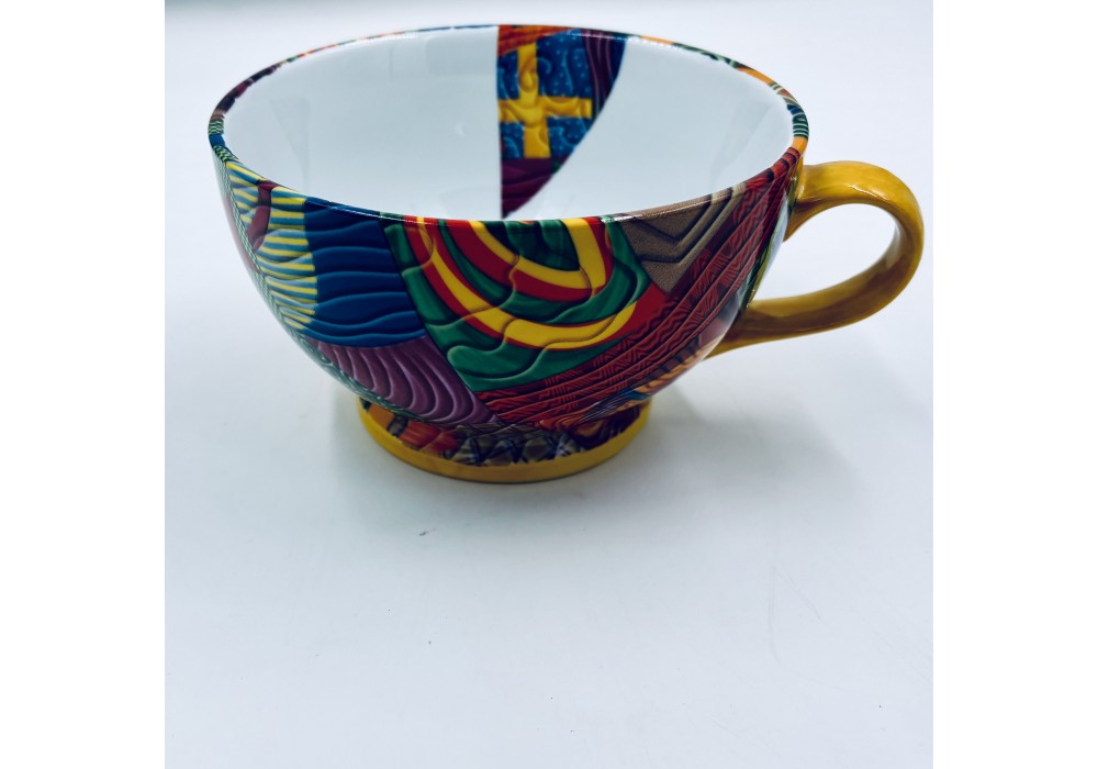 grand bol avec anse décoré au chromo d'un décor moderne et coloré la contenance 75cl , anse peinte à la main .