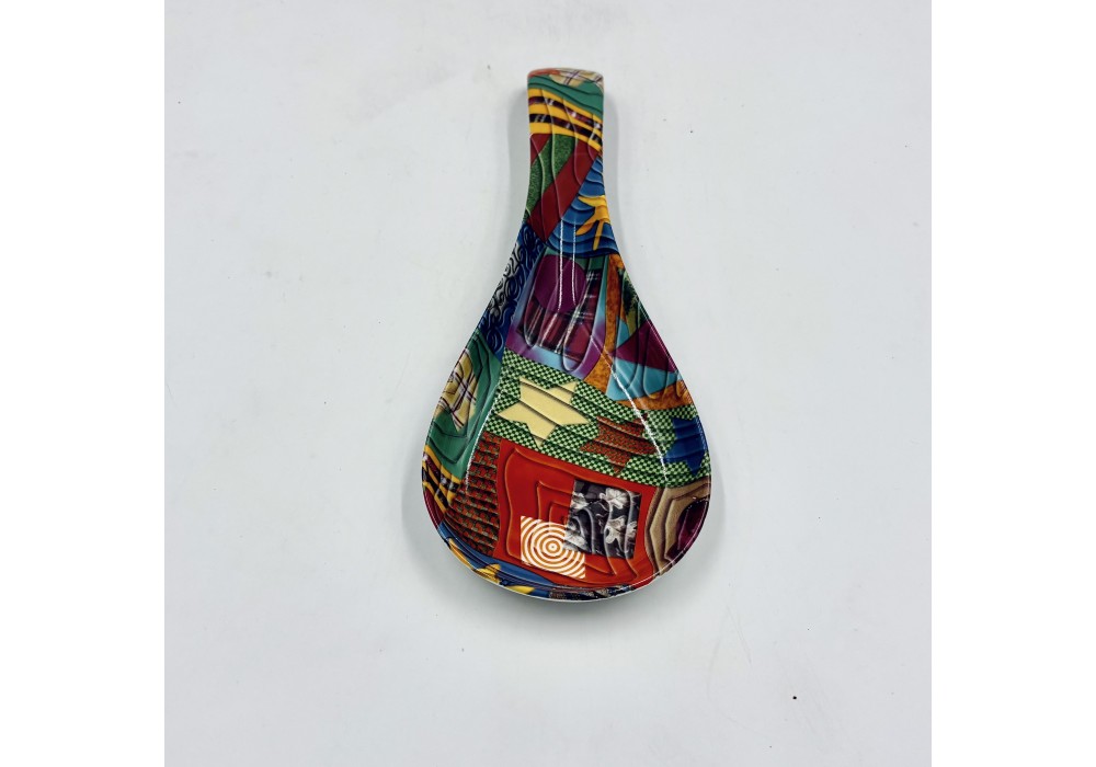 repose cuillère en porcelaine décoré au chromo de patchwork coloré . Parfait pour éviter de salir le plan de travail à coté de la plaque de cuisson .