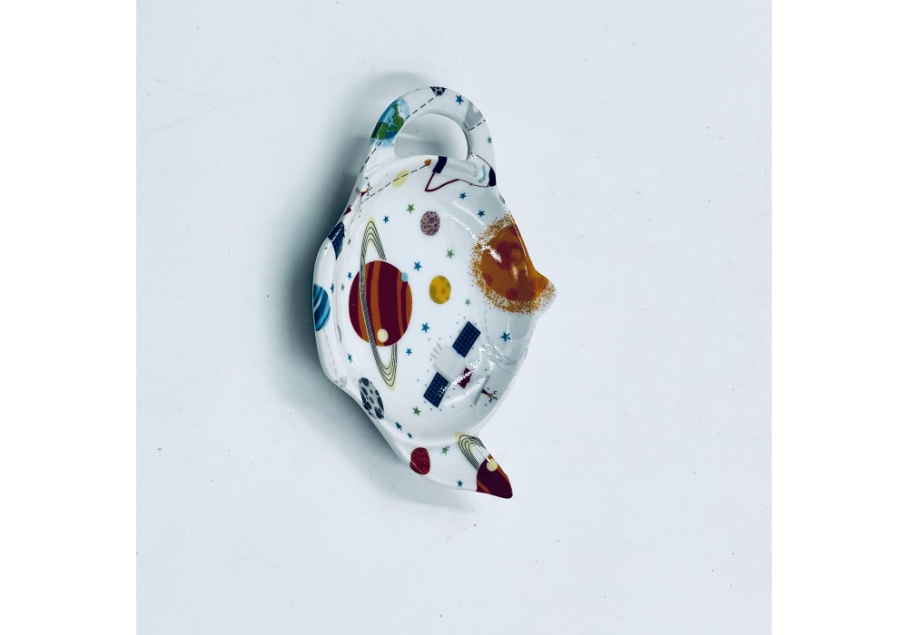 repose thé en forme de théière décoré au chromo de planètes colorées