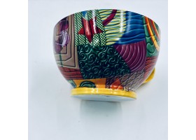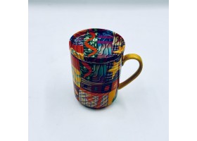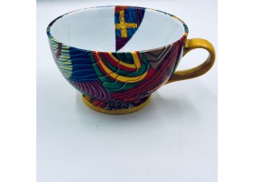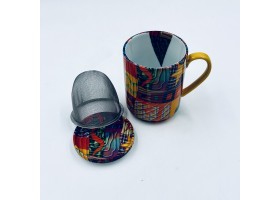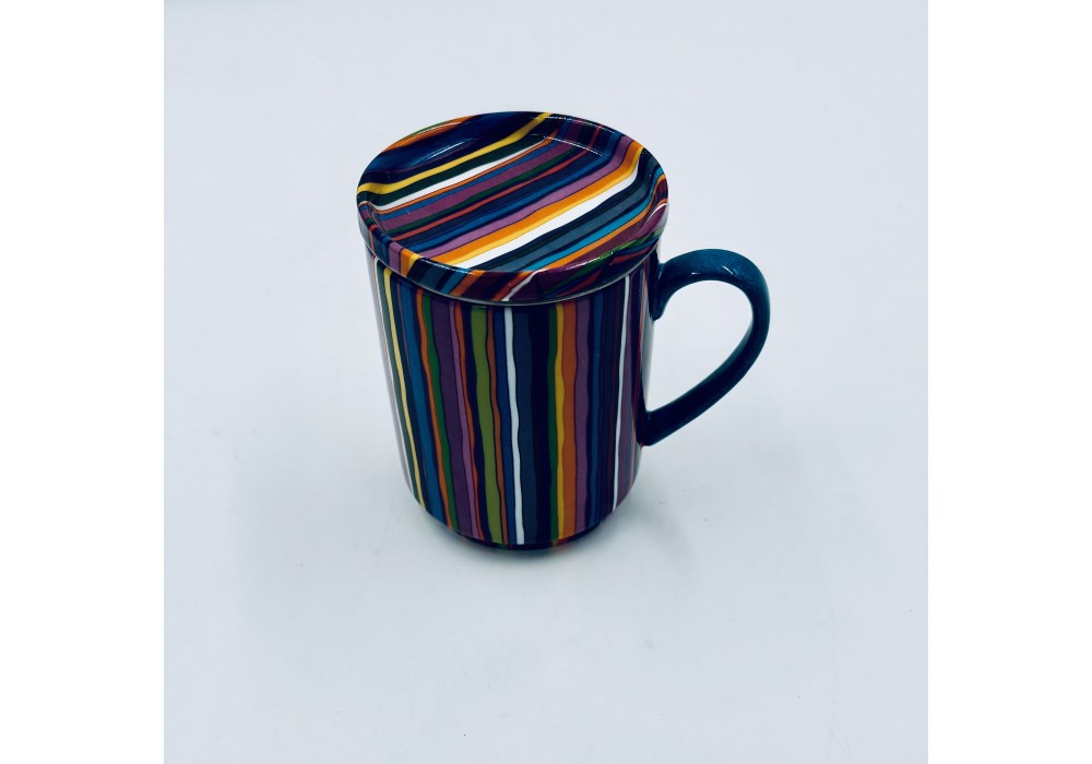 tisanière 3 pièces décor au chromo de rayures colorées avec filtre métallique . Anse peinte à la main .